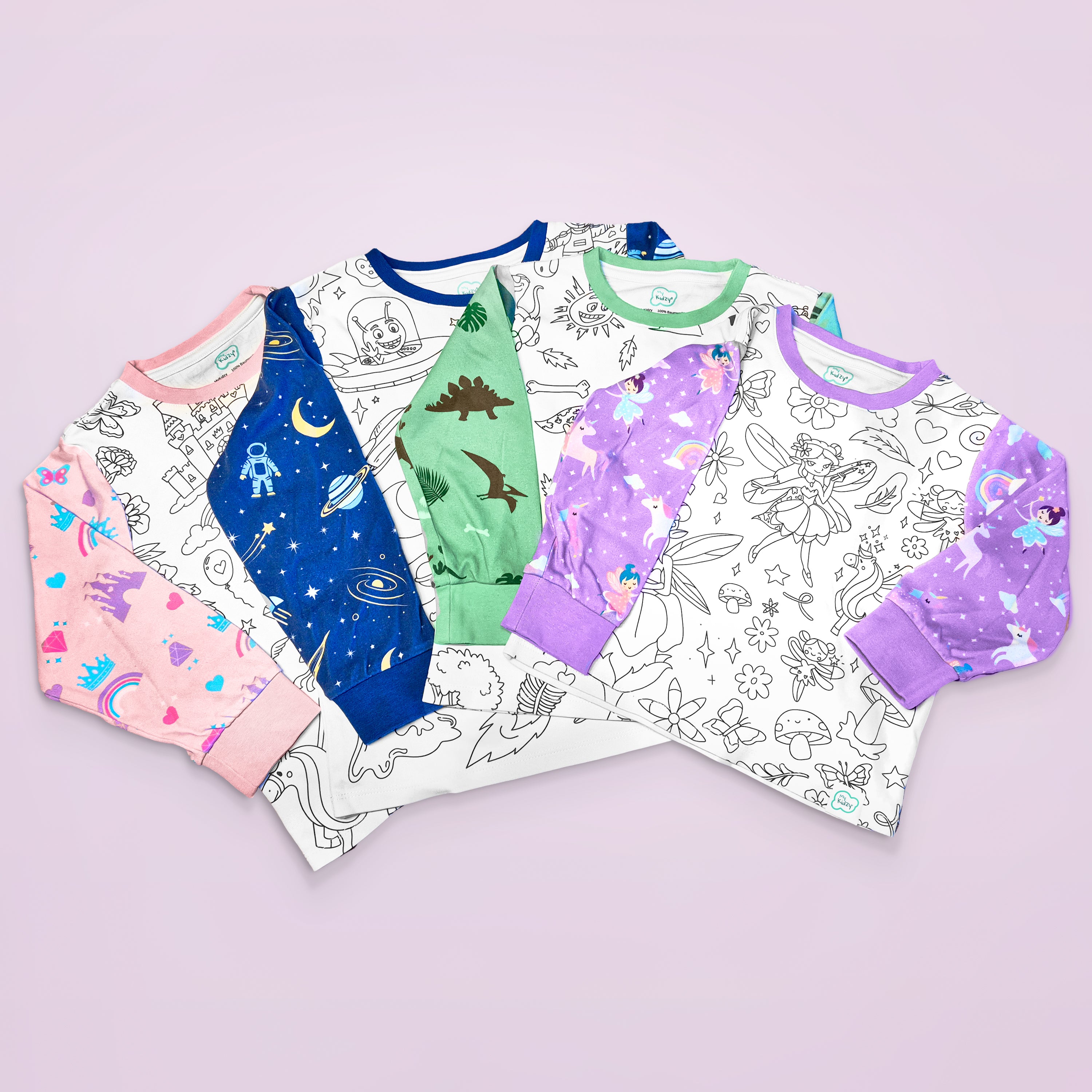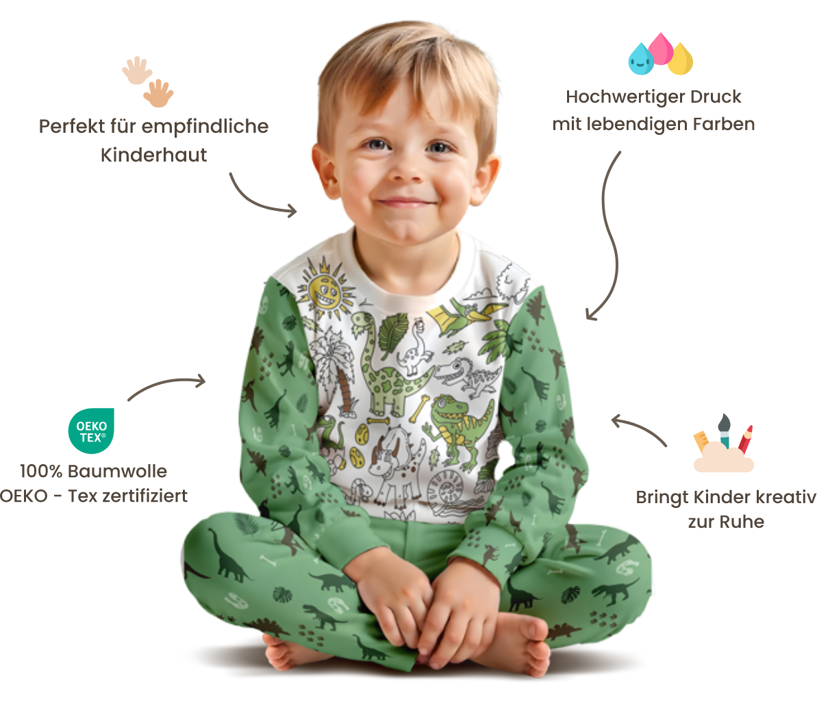Deshalb haben wir ausmalbare Pyjamas entwickelt, die nicht nur gemütlich sind, sondern Kindern helfen, zur Ruhe zu kommen, stolz ihre Kunstwerke zu tragen und dabei ihre Fantasie auszuleben.