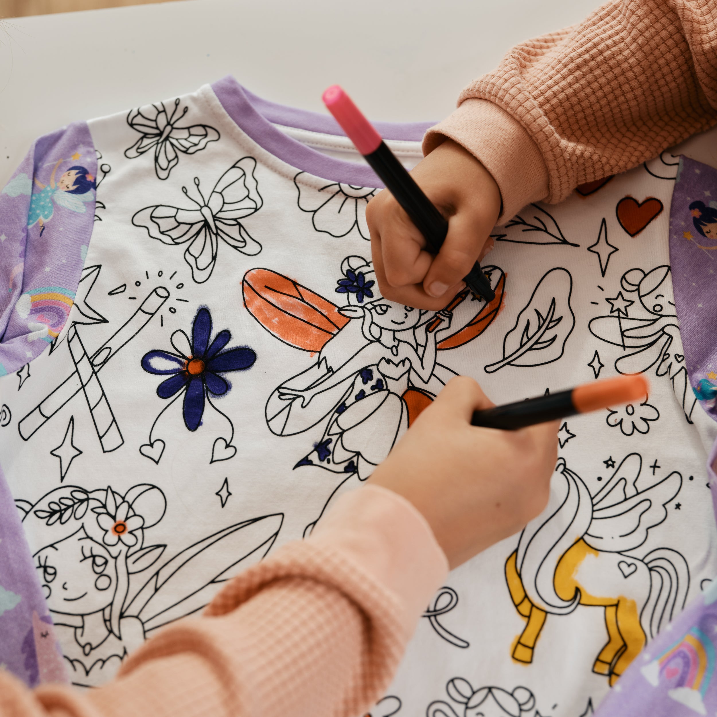 Deshalb haben wir ausmalbare Pyjamas entwickelt, die nicht nur gemütlich sind, sondern Kindern helfen, zur Ruhe zu kommen, stolz ihre Kunstwerke zu tragen und dabei ihre Fantasie auszuleben.