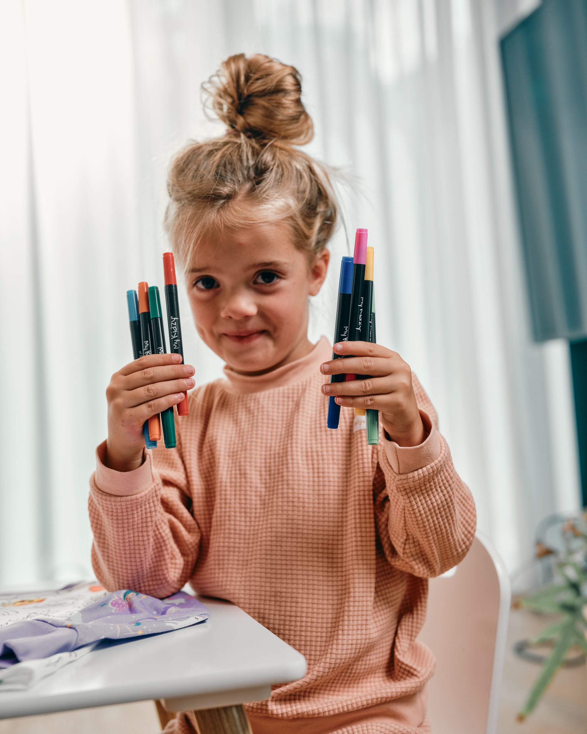 Mit dem 16er Set permanenten Textilstiften von MyKidzy bringst du deine bunten Kunstwerke dauerhaft auf Stoff – ganz ohne Verschmieren. Speziell entwickelt für unsere ausmalbaren Pyjamas, Sonnenhüte oder Hundebandanas – für Ergebnisse, die auch nach vielen Wäschen strahlen.